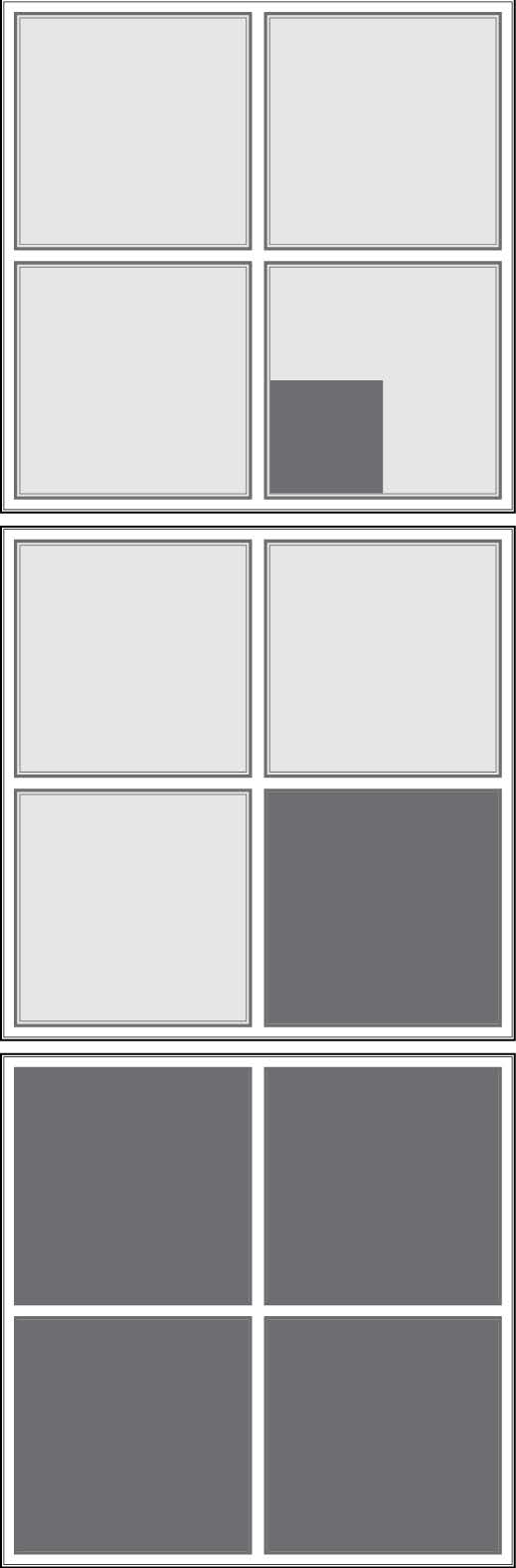 Рис. 2. Ренормализационная группа, шаги от первого до третьего (начиная сверху). В каждом из четырех квадратов – по четыре меньших квадрата, один из них на первом шаге серый, дальше возникает власть меньшинства