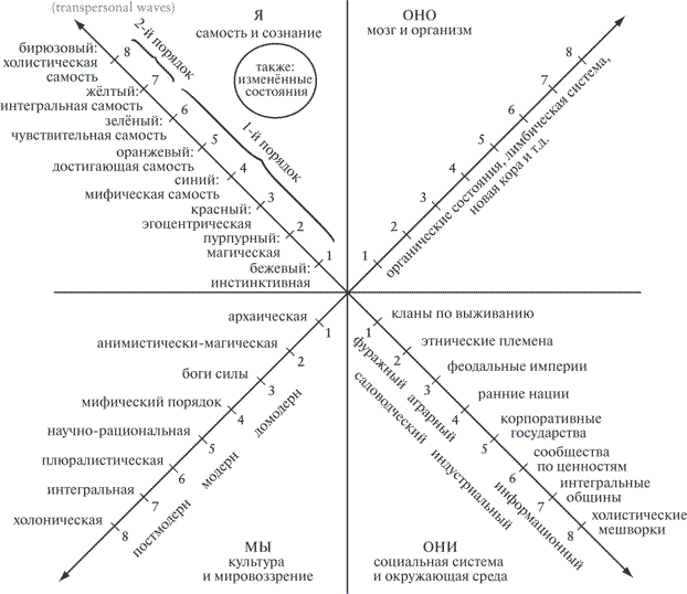 • множества органических факторов и состояний мозга (данному верхне-правому квадранту сегодня больше всего внимания уделяется со стороны психиатрии, когнитивных наук и нейробиологии; но, сколь бы значимым он ни был, он все еще составляет «четверть» всей истории);