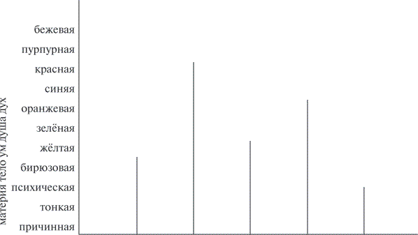 • множество уровней, или волн, бытия, величественную холархию, охватывающую весь спектр сознания – от материи до тела, ума, души и духа (или от бежевого до пурпурного, красного, синего, оранжевого и… тонкого, причинного, недвойственного)[61]. Прохождение этих уровней развития сопровождается;
