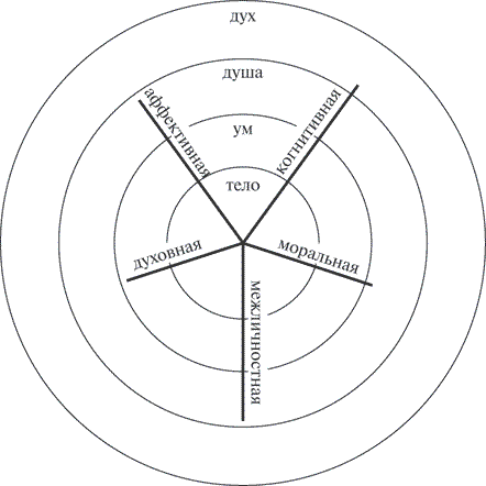 Что же, в таком случае мы можем сказать о более интегральной модели человеческих возможностей? Прежде чем мы сможем обсудить потенциалы применения интегрального видения в образовании, политике, бизнесе, здравоохранении и т. д., нам необходимо прийти к какой-то общей идее, что же мы, собственно, собрались применять. Когда мы совершаем переход от плюралистического релятивизма к универсальному интегрализму, какая карта разворачивается перед нами? Мы уже видели, что более целостная, или интегральная, картография может включать: