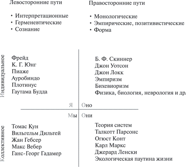 На рис. 3.6 проиллюстрирован тот факт, что в течение человеческой истории различные теоретики, как правило, фокусировались на каком-то одном квадранте, зачастую ценой исключения других. «Правосторонние пути» фокусировались на внешних квадрантах – том, что можно воспринять при помощи органов чувств или усиливающих их инструментов. Теоретики и исследователи верхне-правого квадранта сосредоточены на внешней стороне индивидов: это бихевиоризм, эмпиризм, физика, биология, когнитивные науки, неврология, нейрофизиология и т. д. (Хотя мозг и находится внутри организма, его исследуют посредством объективного, внешнего, научного рассмотрения, а посему он и является частью верхне-правого квадранта.) Верхнеправый квадрант – это то, что мы часто называем естественными науками.
