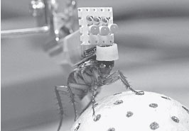 Рис. 17. RoboRoach, Роботаракан. Управление движением таракана через вживленный ранец-микроробот. Тараканий «ранец» содержит приемник, преобразующий сигнал с удаленного пульта в электрический стимул, подаваемый на антенны таракана. Это позволяет оператору приказать таракану остановиться, двигаться вперед, пятиться и поворачивать вправо или влево. На сегодняшний день возможно успешно управлять также крысами или летающими насекомыми, посылая сигнал напрямую в нервную систему. Фото: Associated Press.