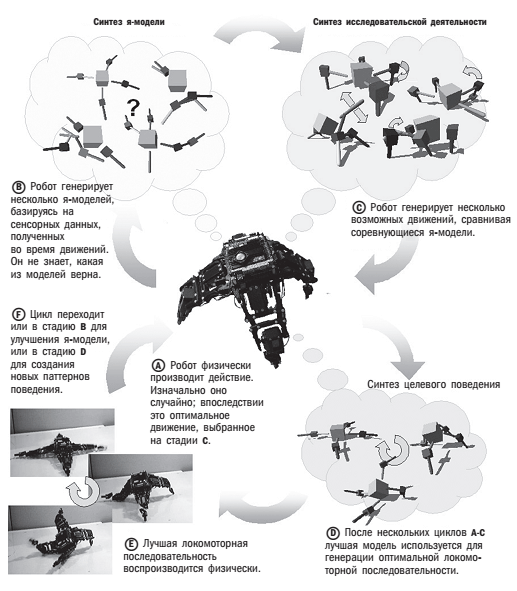 Рис. 18b. Циклы действий робота во время движения. А и В: Синтез я-модели. Робот физически производит действие. А: Сначала действие производится случайным образом, затем выбирается лучшее из действий, найденное в стадии С. В: Затем робот генерирует несколько я-моделей, сравнивая сенсорные данные, собранные при выполнении предшествующего движения. Он знает, которая из моделей верна. С: Синтез экспериментальных данных. Робот гененрирует несколько возможных движений, сравнивая конкурирующие я-модели. D: Синтез целевого поведения. После нескольких циклов от А до С лучшая из наличных моделей используется для генерации оптимальной локомоторной последовательности. Е: Лучшая из локомоторных последовательностей выполняется физически5. Фото: Джош Бонгард