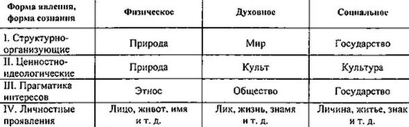 В сущности, наиболее глубокие исследователи именно в такой проекции и реконструировали исходные ментальные соотношения, характерные для народного сознания. Земледелец—воин—жрец — это архетипические фигуры древней иерархии. С точки зрения «прагматики интересов» В. Н. Топоров обсуждает три ключевые идеи (концепты) древнерусской культуры, «ставшие со временем нравственными императивами русской жизни, которые так или иначе учитывались в последующем развитии самосознания» [Топоров 1987: 187], а именно: единство в пространстве и в сфере власти (государство), единство во времени и в духе (общество), святость как высший нравственный идеал личного поведения (жертвенность ради народа).