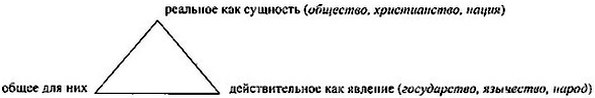 Осталось заметить, что каждый компонент триединой формулы по отдельности — не русского происхождения. И каждый термин заимствован — это кальки. «Православие» на Западе известно тоже, там оно называется «католичество»; самодержавие — слепок с греческого «автократия»; народность, калька с немецкого Volkstum (термин романтиков начала XIX в.). Выходит, что формула графа С. А. Уварова (1832) вовсе не формула «русской имперской идеи». Хотя объективно трехчастность внешней формы бытия сложилась исторически в такую именно формулу, очень удачную: она воспроизводит абсолютный принцип Троицы. В трехмерном пространстве формулы, утвердившей рождение формы, и происходило затем развитие всех релевантных признаков русской ментальности.