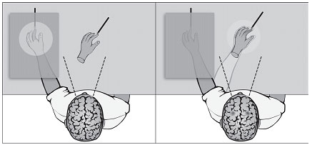 Рис. 2. Иллюзия резиновой руки. На рисунке справа изображена иллюзия, возникающая у испытуемого при связывании осязательных ощущений от касания зонда с видимыми прикосновениями. Темным обозначены зоны повышенной активности в мозгу; феноменально переживаемая, иллюзорная позиция руки обозначена светлыми линиями. Активность нейронов в премоторной зоне коры головного мозга в момент иллюзии доказана экспериментально. (M. Botvinick, J. Cohen. Rubber hand “feels” touch that eyes see // Nature 391:756 (1998)).