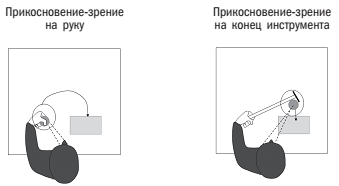 Рис. 3. Интеграция зрения и осязания. Испытуемый пытается передвинуть монетку (маленький темный кружок) на поднос с помощью собственной руки и с помощью орудия. На правом рисунке изображено, как обобщенное переживание вида и прикосновения переносится от руки на кончик инструмента. Пунктирные линии отмечают направление взгляда испытуемого, а стрелки – направление движения. Большие белые круги показывают область, где – согласно осознаваемой модели реальности – объединяются ощущения вида и касания. Рисунок любезно предоставлен Анжело Маравита.