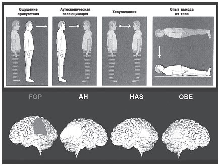 По свежим данным, феноменальное переживание внетелесности зависит не только от правой половины височно-теменного узла, но и от области в левой половине, так называемой экстрастриарной области тела. Свой вклад в этот сознательный опыт, возможно, вносят разные участки мозга. Также может оказаться, что ОВТ не является однородным. Например, феноменология выхода из тела весьма различна в зависимости от описаний: первые секунды при спонтанном ОВТ у здоровых людей и у больных, в частности эпилептиков, явственно различаются. ОВТ может начинаться по-другому и у практикующих различные духовные упражнения. Более того, возможны нейрофеноменологические сходства между осознанными сновидениями (см. главу 5), ОВТ и теми иллюзиями, что касаются тела в общем.
