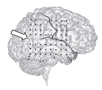 Рис. 8. На рисунке показана правая угловая извилина с электродами, где повторяющаяся электрическая стимуляция вызывает не только ОВТ, но также ощущение трансформации рук и ног или ощущение смещения всего тела. Перепечатано с разрешения Macmillan Publishers Ltd. (Nature, Volume 419, 19, September 2002).