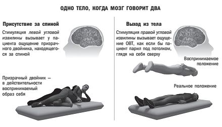 Рис. 9. Недавние опыты доктора Олафа Бланка дают новое научное понимание ощущений, которые часто объяснялись сверхъестественными причинами. Стимуляция угловых извилин в разных полушариях мозга приводила к двум различным результатам: ощущению некоего телесного присутствия за спиной и ОВТ (источник: д-р Олаф Бланк. Рисунок Грэма Робертса, «Нью-Йорк таймс»).