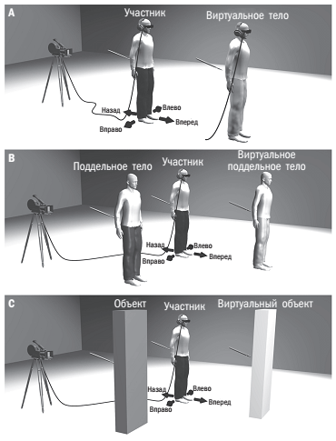 Рис. 12. Создание аналога иллюзии резиновой руки для всего тела. (А) Участник эксперимента (в темных брюках) видит через HMD (head-mounted display – приспособление, которое носят на голове и которое показывает изображение, идущее с компьютера, на экране прямо перед глазами участников или даже проецирует изображение на сетчатку) на дисплее трехмерное изображение своего виртуального тела (в светлых брюках), стоящее в двух метрах впереди и поглаживаемое то синхронно, то асинхронно вместе со спиной участника. В других условиях участник видит или (В) – виртуальное «поддельное тело» (а именно спину манекена в светлых брюках), синхронно или асинхронно поглаживаемое со спины, или (С) – виртуальный небиологический объект, не схожий с телом, который тоже поглаживают. Темным цветом обозначено действительное расположение тела или объекта, а светлым – виртуальное положение, показанное на дисплее. Иллюстрация М. Бойера.