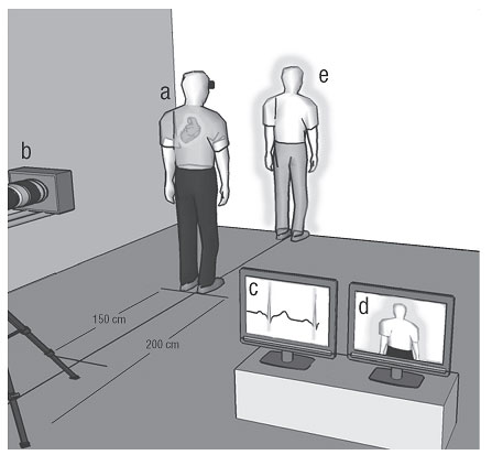 Рис. 13. Во время так называемого «опыта с сердцем» участник стоял спиной к расположенной в двух метрах за ним камерой. На дисплей перед его лицом передавалась запись в реальном времени. Снимаемая одновременно кардиограмма в виде цветного силуэта окружала изображение тела и мигала в такт сердцебиению подопытного. Для участника эксперимента это выглядело так, будто виртуальное тело и его очертания, освещающиеся в такт сердцебиению, расположены в двух метрах впереди.