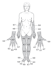 Рис. 15. Возможное доказательство врожденных компонентов телесной я-модели. Фантомные (темные) участки у человека, родившегося без конечностей. Числами показана живость телесных ощущений по шкале от 0 (не ощущаются) до 6 (самое живое ощущение, то есть как реальных конечностей). Рисунок любезно предоставлен Петером Брюггером, Цюрих.