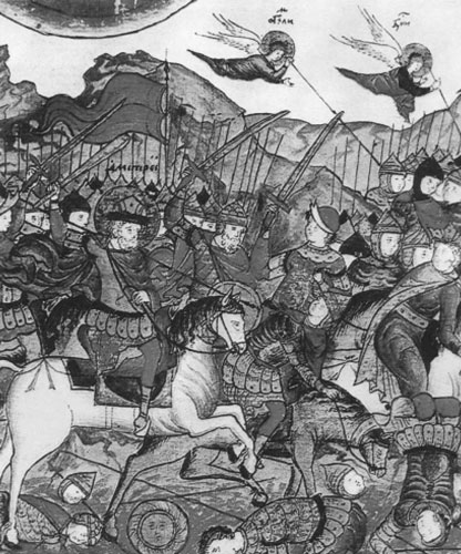 В Куликовской битве войско князя Дмитрия Донского (летописец оставил нам его словесный портрет: «беаше же сам крепок зело и мужествен, и телом велик и широк, и плечист, и чреват вельми, и тяжек собою зело; брадою же и власы чёрн, взором же дивен зело») разбило полчища темника беклярбека (управляющего бластью, внутренним улусом) Мамая.