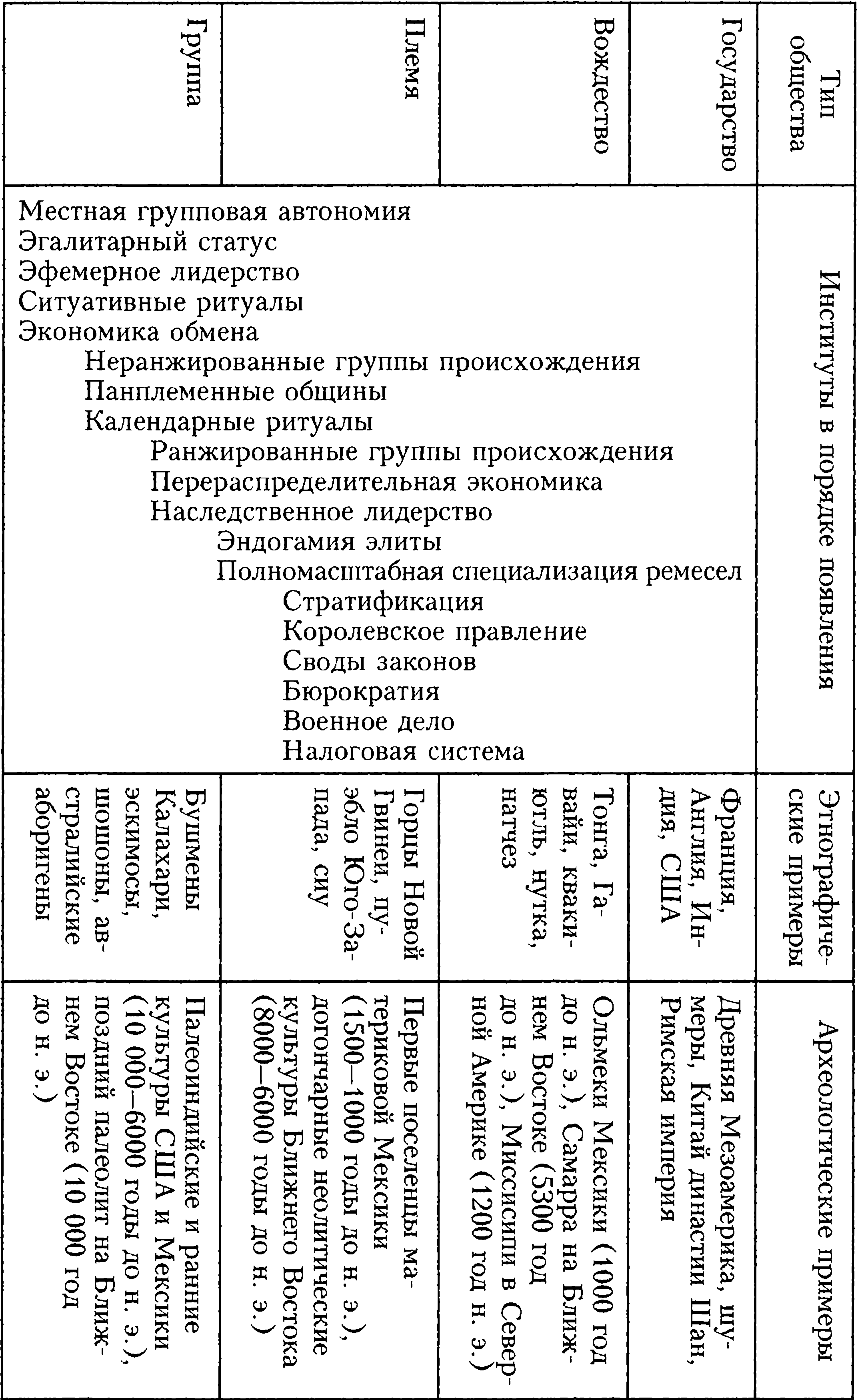 По мере того как общества становятся крупнее, в них появляются новые институты, причем в довольно строгом порядке. На этой диаграмме показаны примеры исторических последовательностей (крайняя правая колонка) и существующих культур (вторая справа колонка). (По данным К. В. Фланнери.){100}