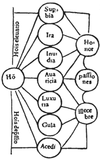 Поскольку имеются две страсти души – жажда почестей и плотское влечение, – коими в разные стороны разрывается беспокойный дух, то каждая из этих страстей выпускает из смертоносного лука в Душу по три стрелы и, пронзив тремя напитанными ядом остриями, бездумно убивает ее. В самом деле, когда, томясь жаждой почестей, Человек желает вознестись выше себя самого, сделаться из ряда вон выдающимся и особенным, он отбрасывается враждебными ветрами на три громадные скалы: Гордыню, Гнев, Зависть, именуемые людьми духовного звания пагубами души. Прельщенный соблазнами плоти, или тела, Человек также становится трижды ниже себя самого и, низвергаясь со своего престола, погружается, несчастный, в троякую бездну: Похотливость, Чревоугодие и Леность, именуемые телесными пороками Человека. С одной стороны, Человек пытается нечестиво вознестись, домогаясь божественных почестей, выше Человека с помощью трех крыльев – тот, кто не может быть сочтен достойным даже людских почестей; с другой же стороны, прельщенный и соблазненный наслаждениями, а также отягощенный трояким грузом, он падает ниже Человека и обретается далеко после него.