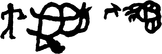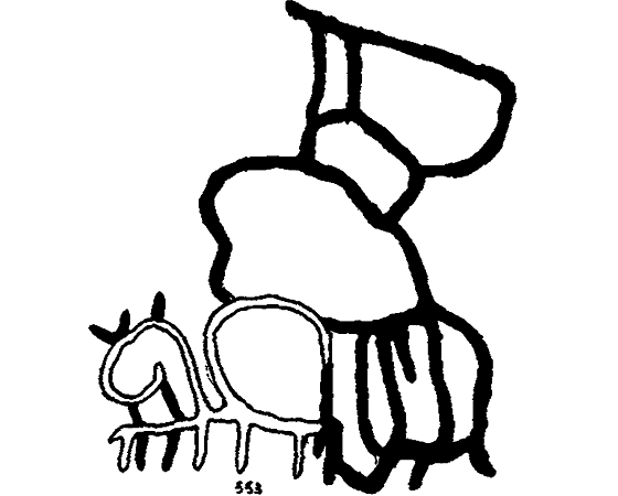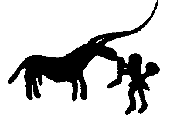 Рис. 13. Лучник удачным выстрелом поразил в ногу тура, очевидно ради того, чтобы доставить его в поселение живым в качестве жертвы богам. Над ним — близнецы. Один из них обязательно в шляпе. Другой без нее. Тот, кто в шляпе радостно приветствует удачливого лучника, видимо избавившего одного из близнецов от смерти.