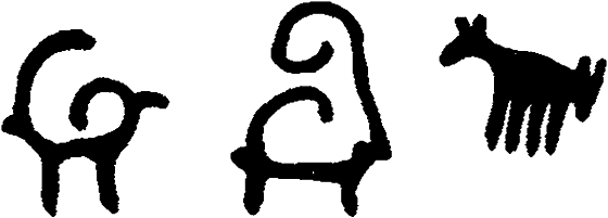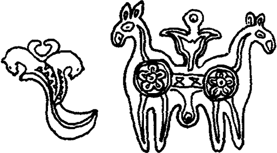 Рис. 15–16. Двуголовые горные козлы-бараны, двухголовая лошадь древних европеоидов андроновцев и их потомков — скифов. На другом рисунке двухголовые лошади древних славян — слева и индоевропейцев — справа. Двухголовые животные символизировали Солнце.