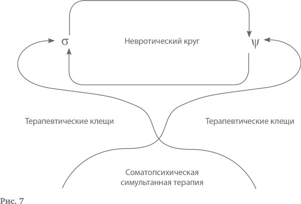 Зачастую именно страх ожидания является собственно патогенным фактором, так как именно он приводит к фиксации симптома. При этом наша терапия должна воздействовать одновременно и на психический, и на соматический полюс этого циклического процесса, в ходе чего она, с одной стороны, воздействует на готовность к страху (также поддающемуся медикаментозному лечению), а с другой стороны, лечит страх ожидания – в том смысле, в котором мы обсудим этот метод далее, когда перейдем к разделу о парадоксальной интенции. Таким образом, нам удается ухватить невротический круг в терапевтические клещи.