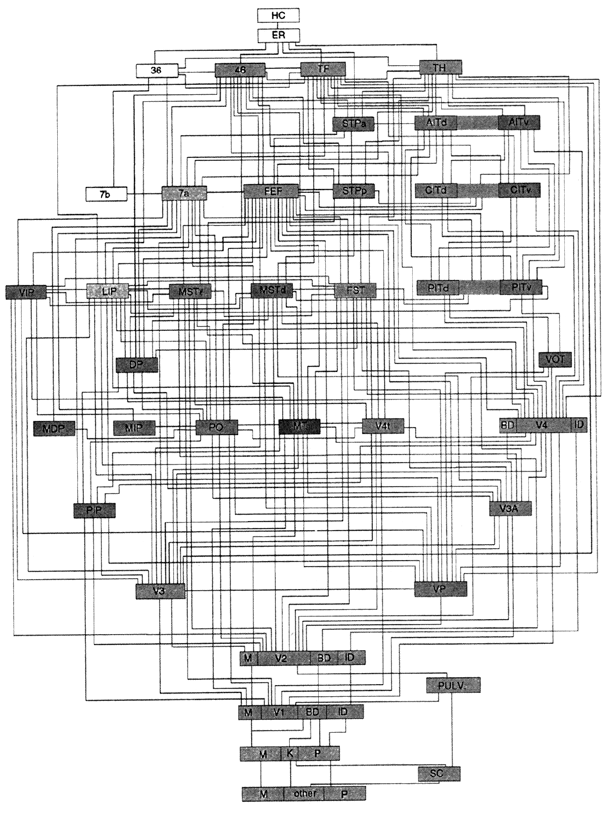 Но если мозг – это сложный орган, состоящий из множества частей, для подобных выводов нет оснований. Первичная сенсорная кора – это не краеугольный камень разума, а устройство, одно из многих, предназначенное для обработки определенных видов сигналов на первых стадиях сенсорного анализа. Представим, что первичная сенсорная кора бесформенна, а структуру ей придают исключительно входные сигналы. Значило бы это, что весь мозг не имеет структуры и получает ее лишь из информации на входе? Вовсе нет. Начнем с того, что даже первичная сенсорная кора – это только одна из частей огромной сложной системы. Чтобы представить вещи в более широком контексте, ниже приведена современная диаграмма связей внутри зрительной системы приматов39 (см. рис. ниже).