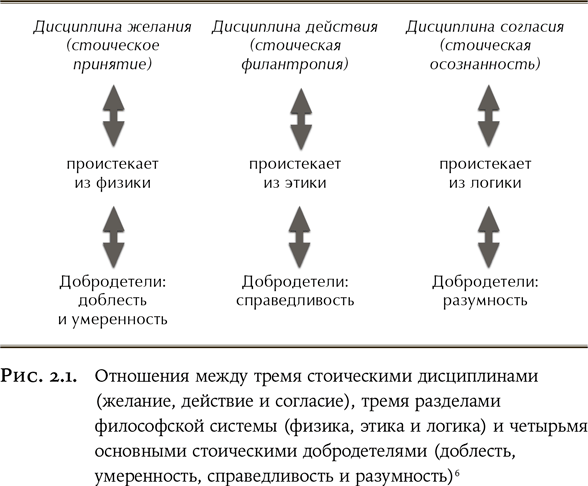 Эта диаграмма представляет собой фундаментальную схему стоической мысли и позволяет понять, что же такое стоицизм. Дисциплина желания (также называемая стоическим принятием) указывает, что нам надлежит и не надлежит хотеть. Это, в свою очередь, проистекает из того факта, что одни вещи находятся в нашей власти, тогда как другие нет. Однако мы можем отличить одно от другого, только понимая, как устроен мир. Ведь люди, не обученные физике, склонны ошибочно полагать, будто контролируют больше, чем на самом деле (принимают желаемое за действительное). За управление желаниями отвечают две из четырех стоических добродетелей: доблесть (умение смотреть в лицо фактам и действовать соответственно) и умеренность (умение обуздывать свои желания и соизмерять их с тем, что достижимо). Дисциплина действия (также известная как стоическая филантропия, в смысле заботы о других) регулирует наше поведение в мире. Дисциплина действия — результат надлежащего понимания этики, размышлений над тем, какую жизнь мы ведем. Она опирается на добродетель справедливости. Наконец, дисциплина согласия (или стоическая осознанность) указывает, как реагировать на различные ситуации, когда мы либо соглашаемся с нашими первоначальными впечатлениями о данной ситуации, либо опровергаем их. Эта дисциплина основана на изучении логики — как надлежит и не надлежит мыслить — и требует такой добродетели, как разумность.